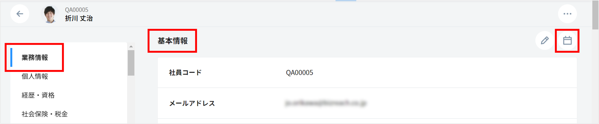 2. カテゴリ「業務情報」> セクション「基本情報」右上のカレンダーアイコンをクリックし、履歴画面を開きます。