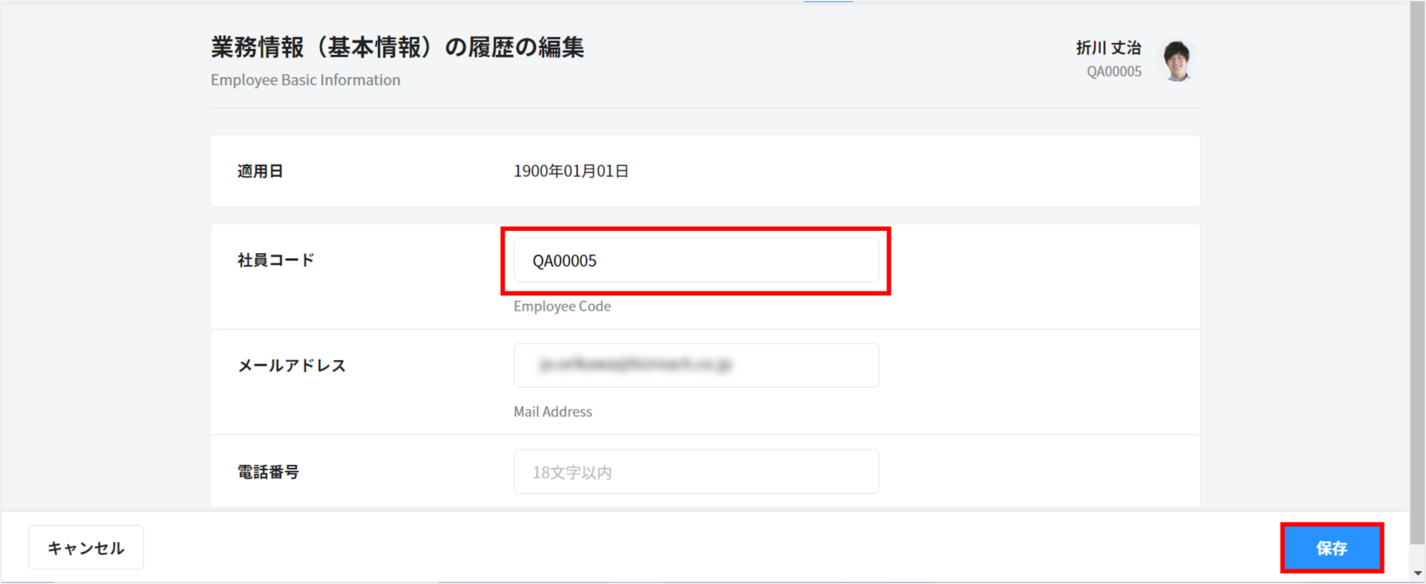 4. 社員コードを削除するか、使用していない別の社員コードに変更して「保存」をクリックします。