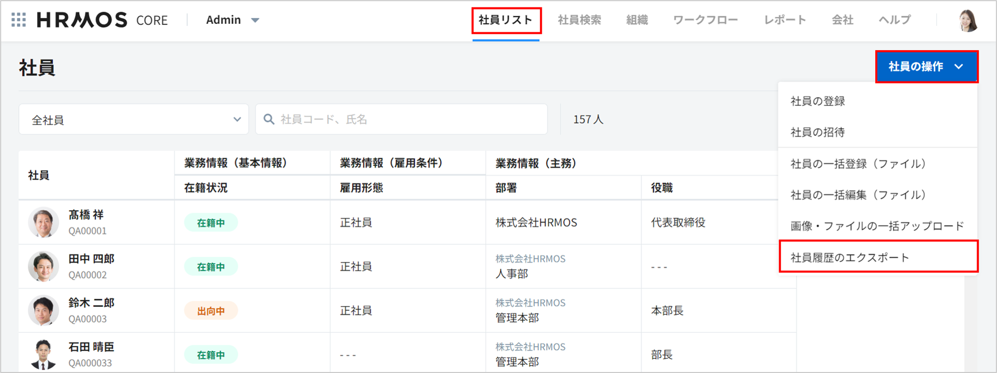 社員一覧右上の「社員の操作」から「社員履歴のエクスポート」をクリックします。