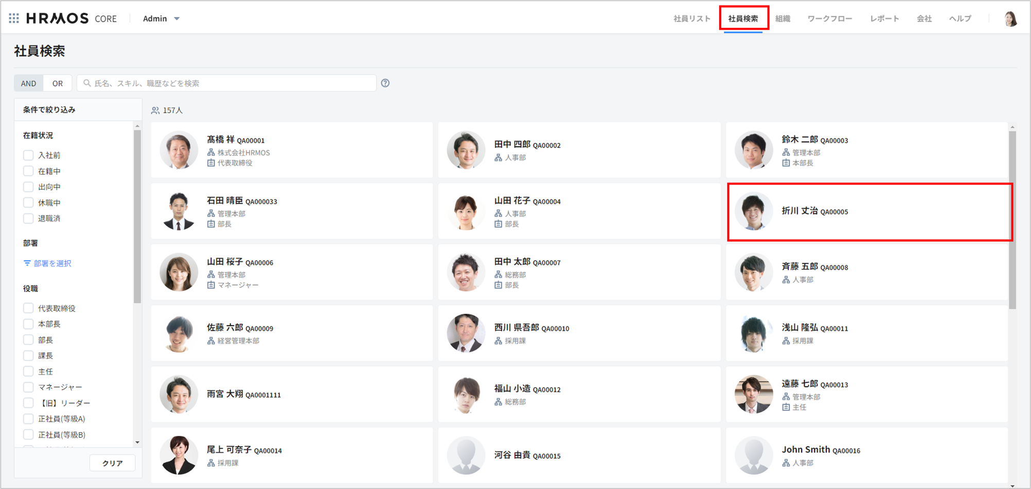 該当アカウントの顔写真をクリックし、社員詳細画面を開きます。