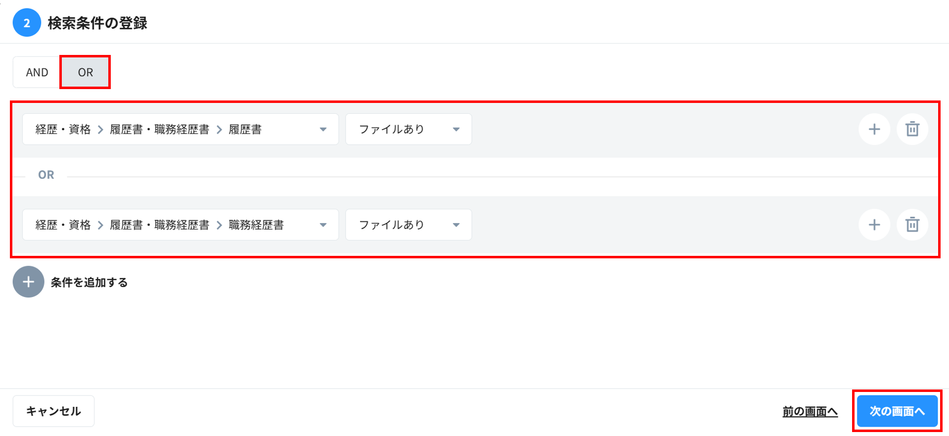 ②表示条件の登録:「経歴・資格>履歴書・職務経歴書>履歴書」が「ファイルあり」