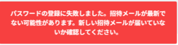 以下の画像のように「パスワードの登録に失敗しました。招待メールが最新でない可能性があります。新しい招待メールが届いていないか確認してください。」と表示される場合、古い招待メールからパスワード設定を行っている可能性がございます。