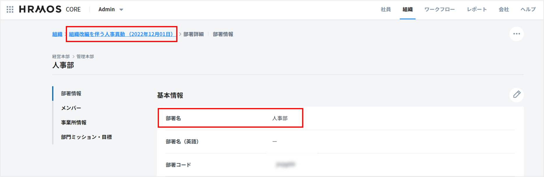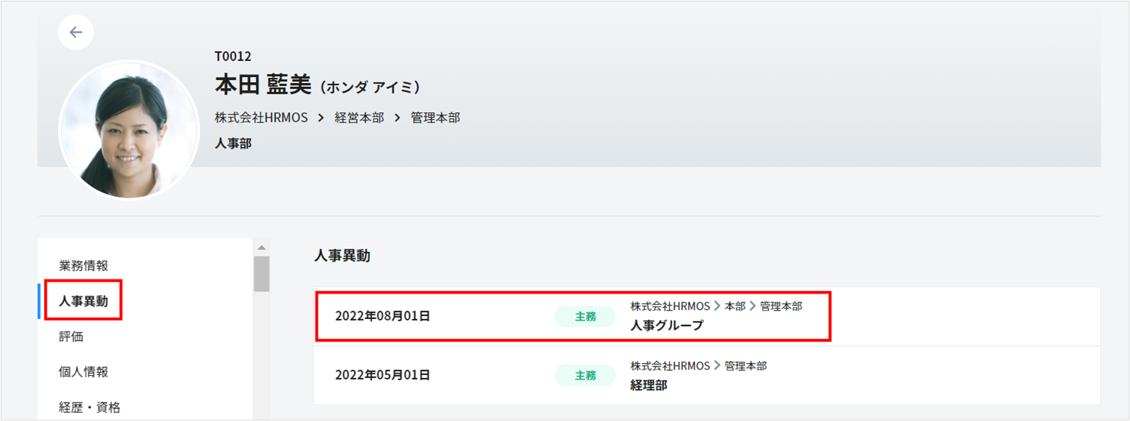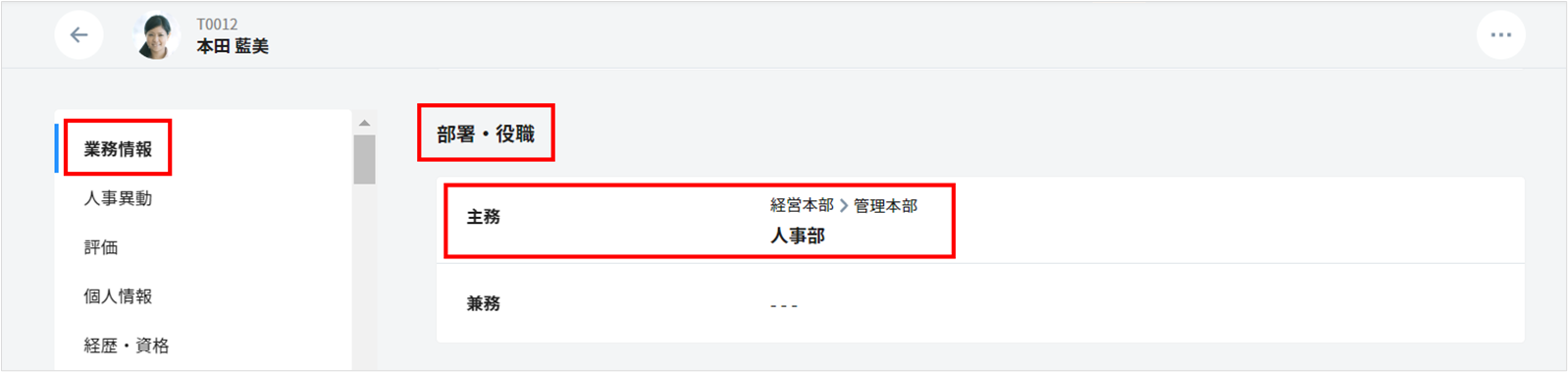 カテゴリ「業務情報」> セクション「部署・役職」には、現在時点の部署名が反映されるため、変更後の部署名が表示されます。