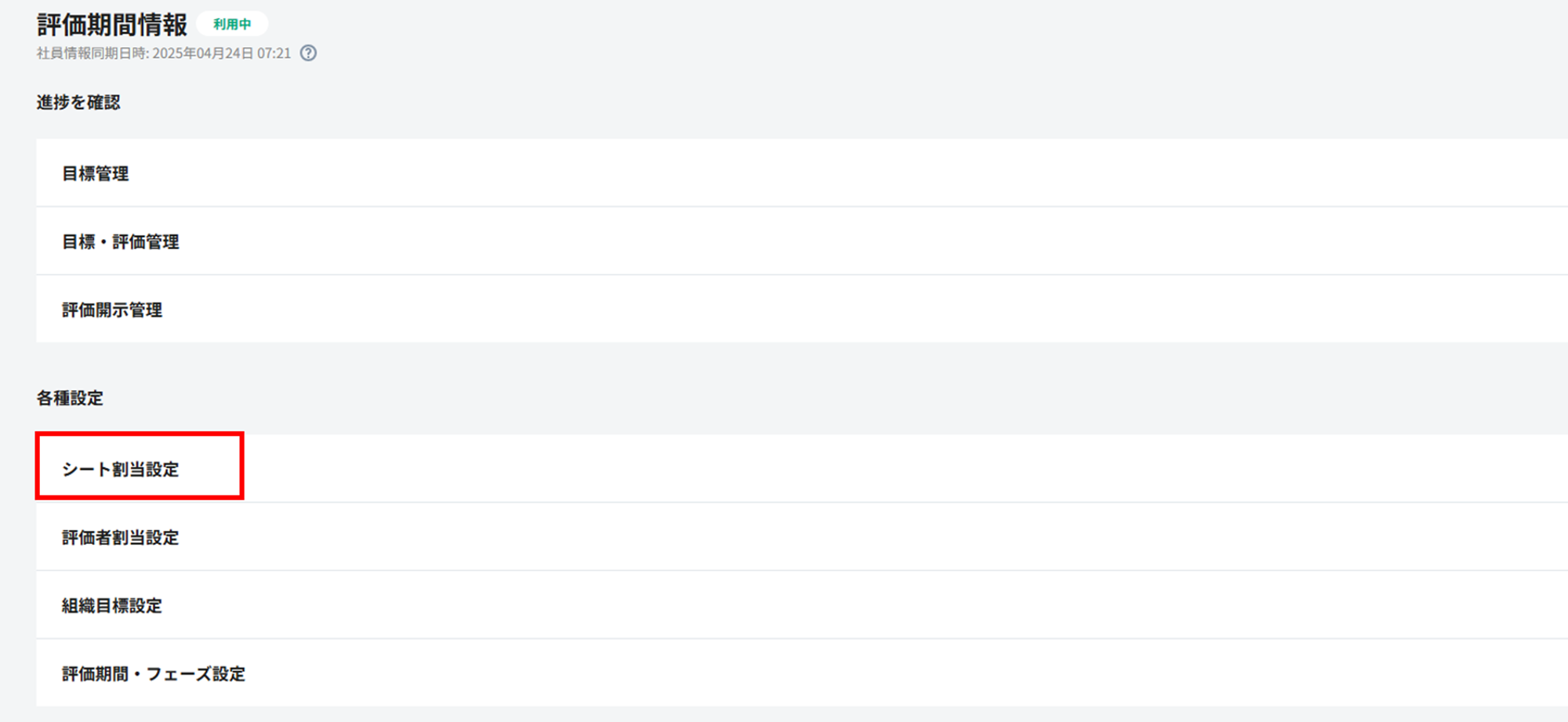 1. 「評価期間」をクリックし、シート割り当てを行う評価期間を選択します。
