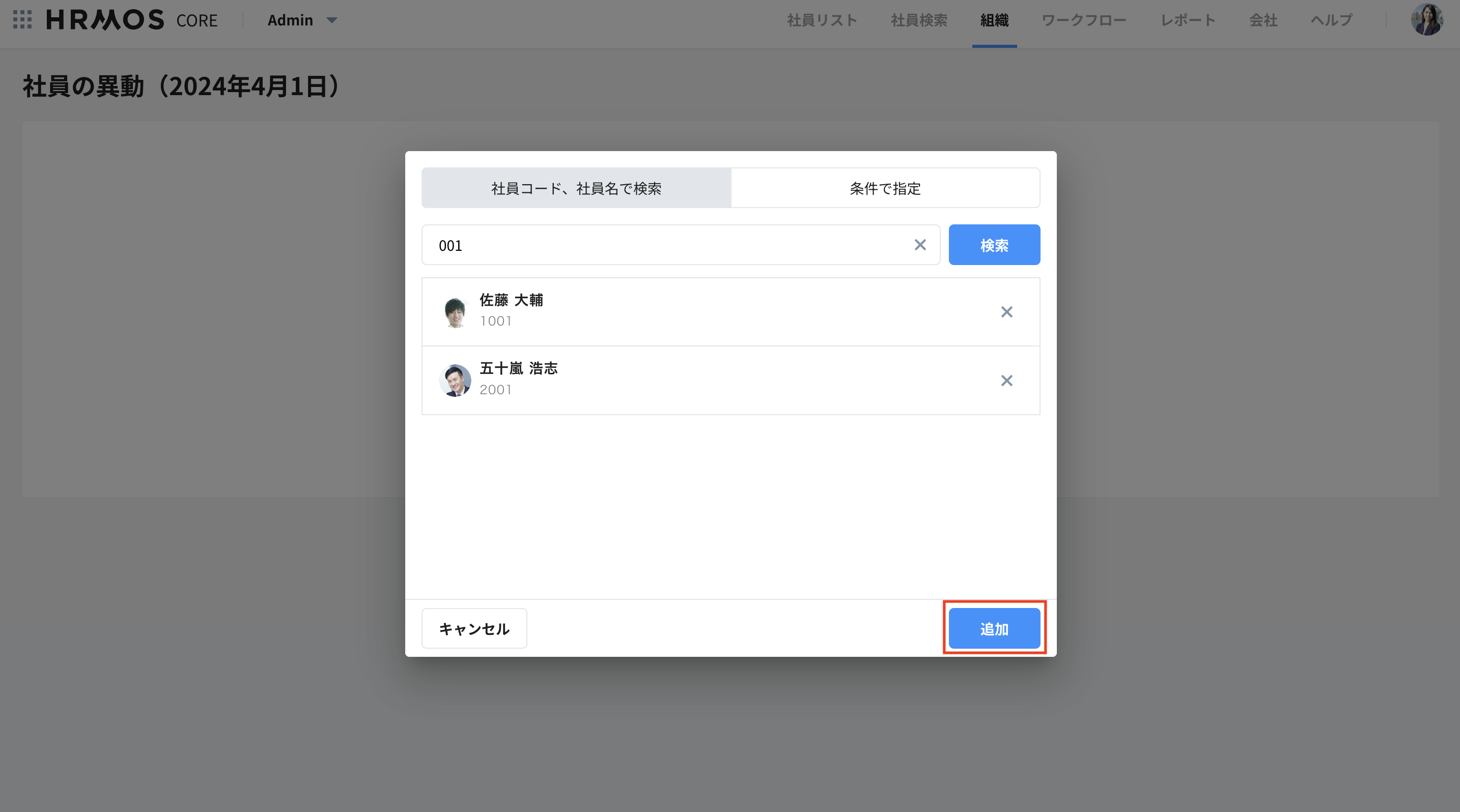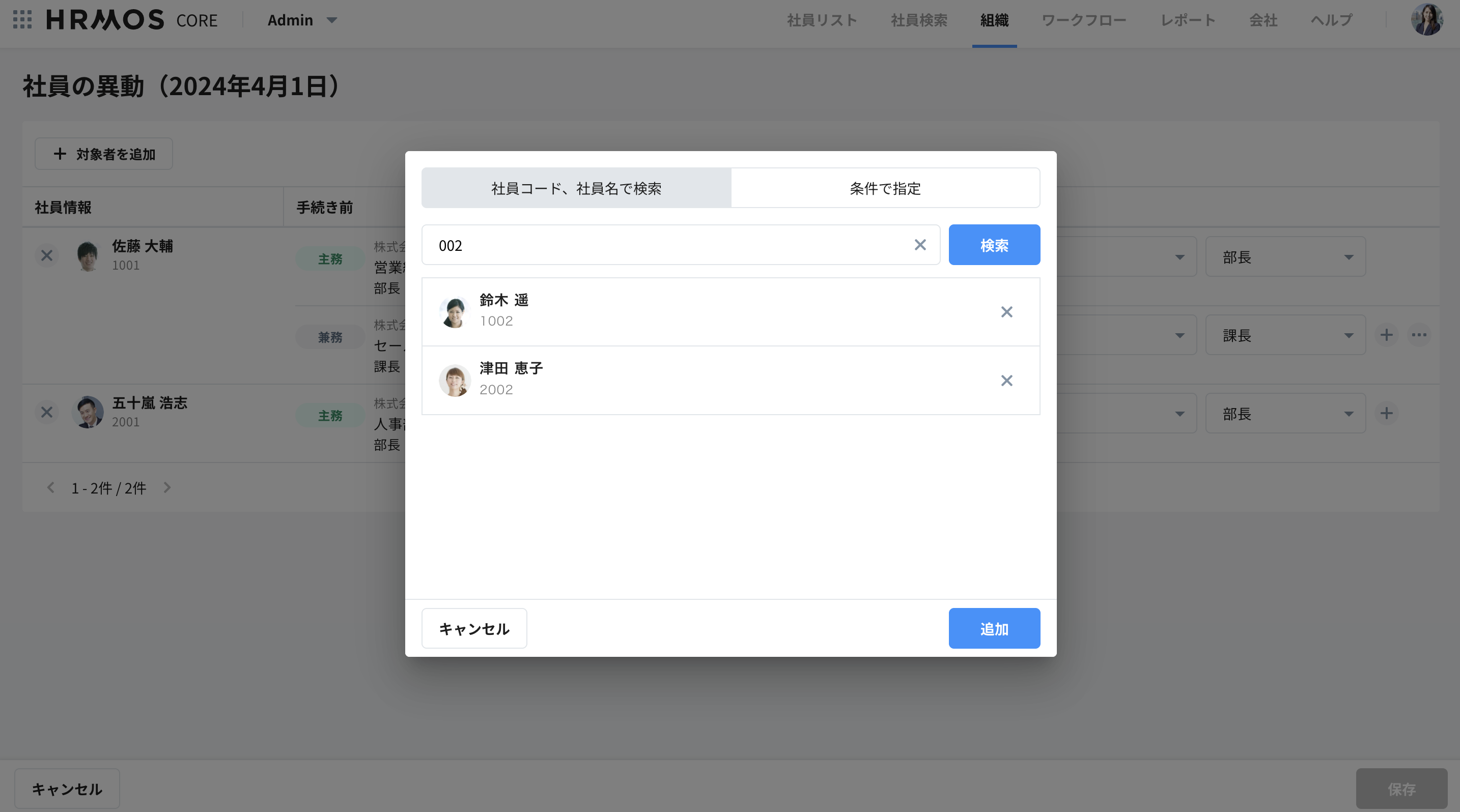 4. 「社員コード、社員名で検索」または「条件で指定」から、対象者の追加を行います。