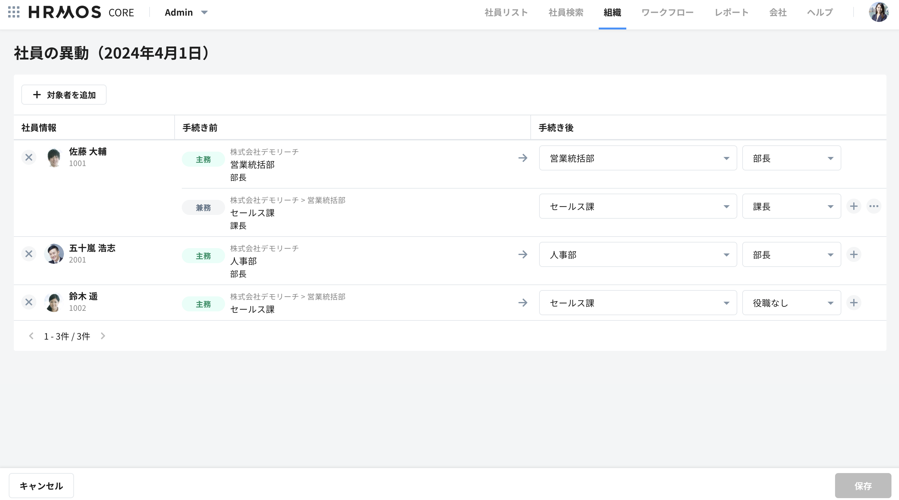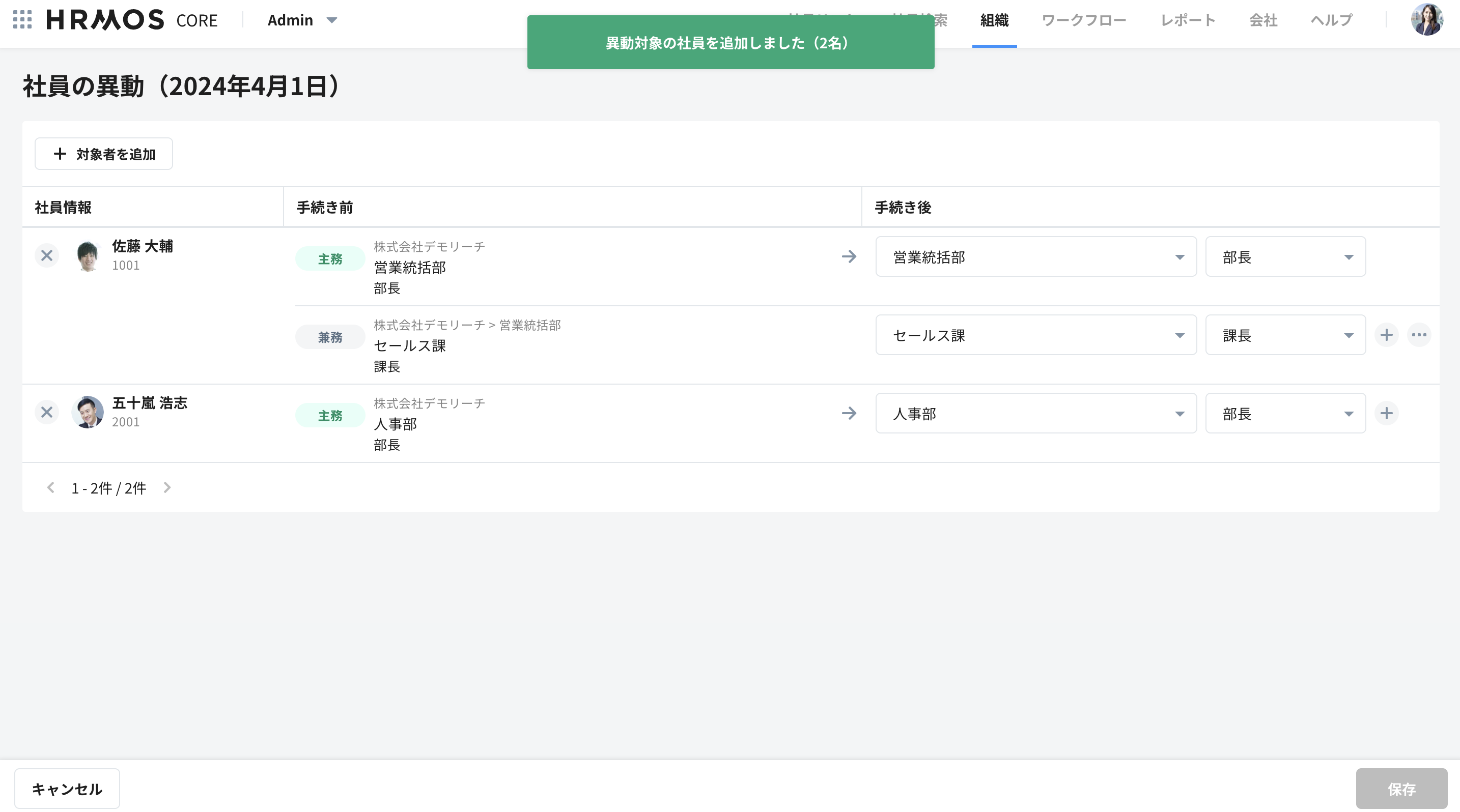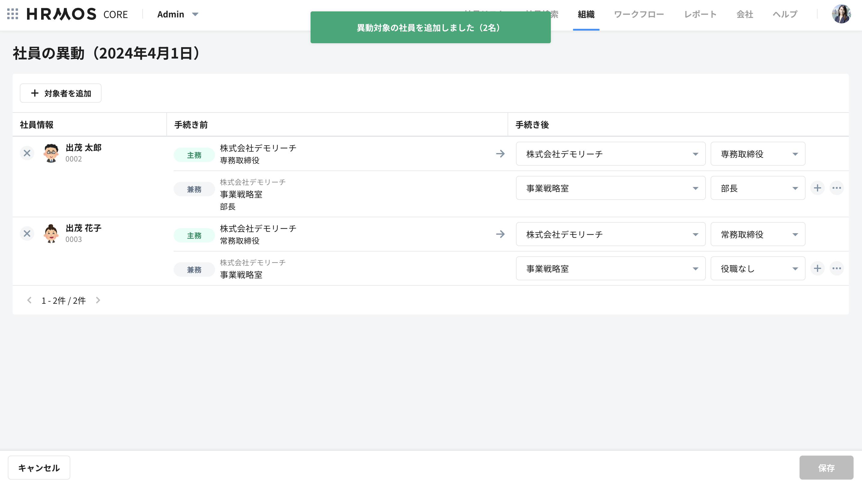 「保存」をクリックすると、異動情報が更新されます。