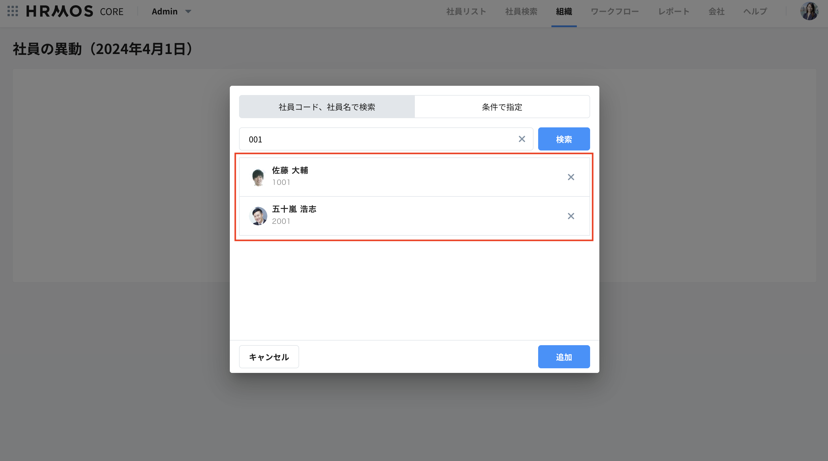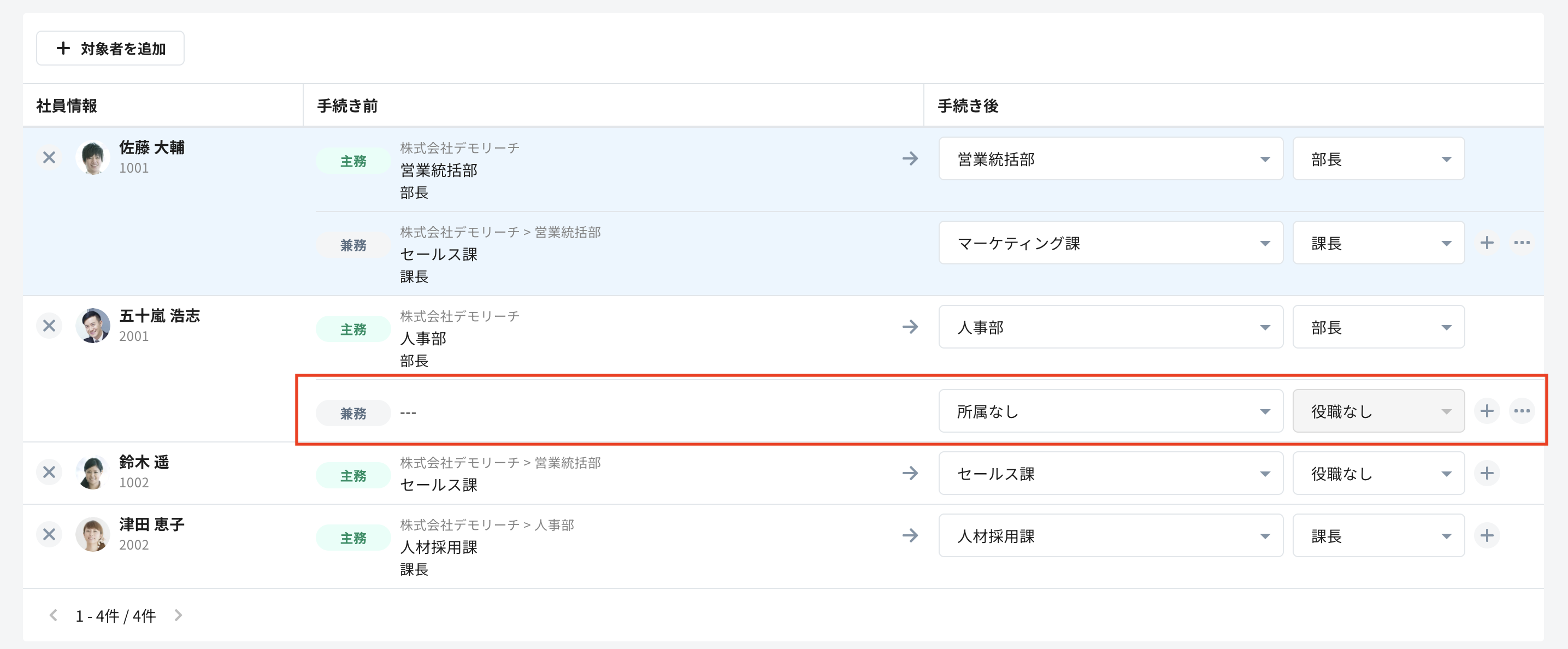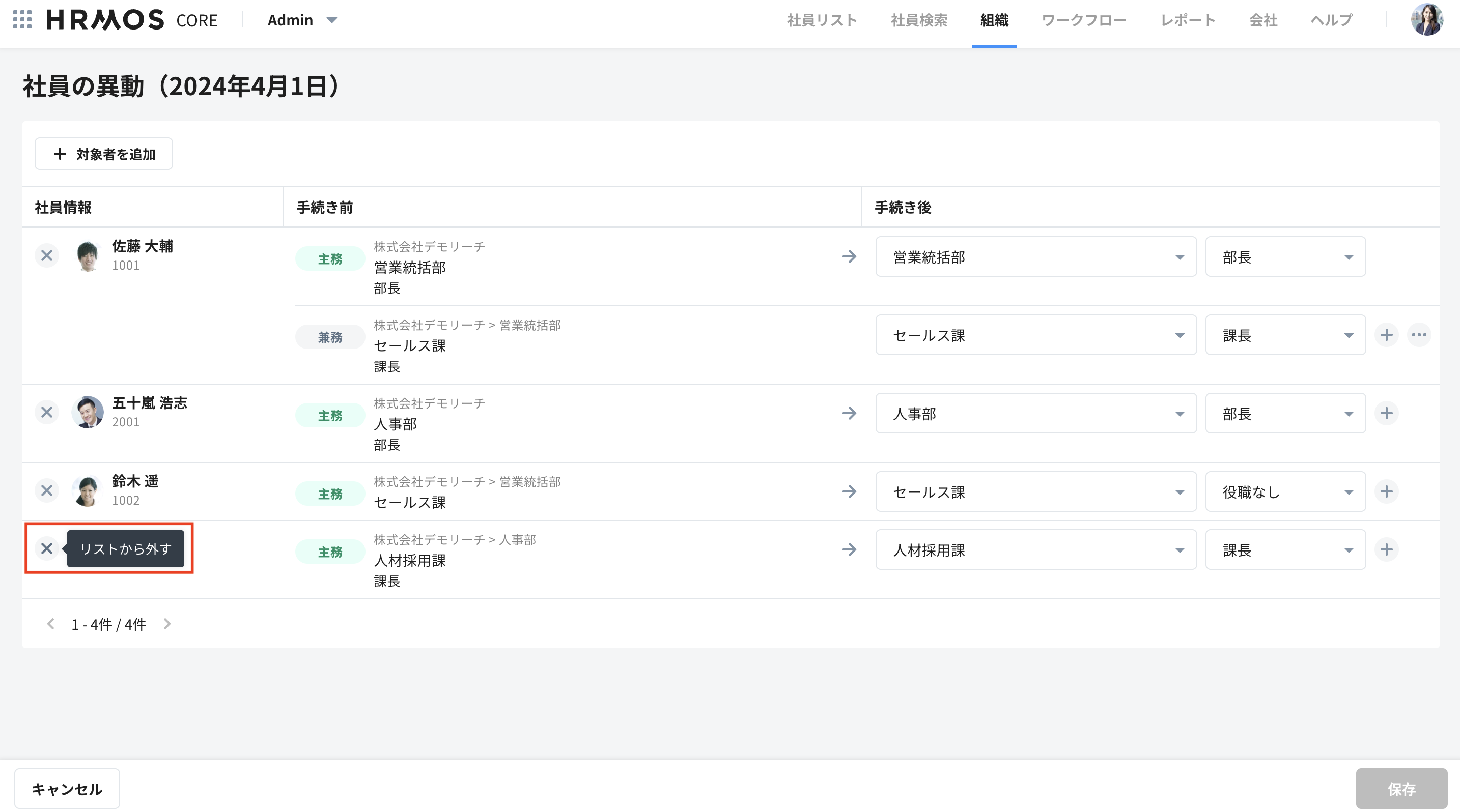 異動対象者を手続きから削除したい場合は、社員名の左にある×ボタンを選択することで削除できます。
