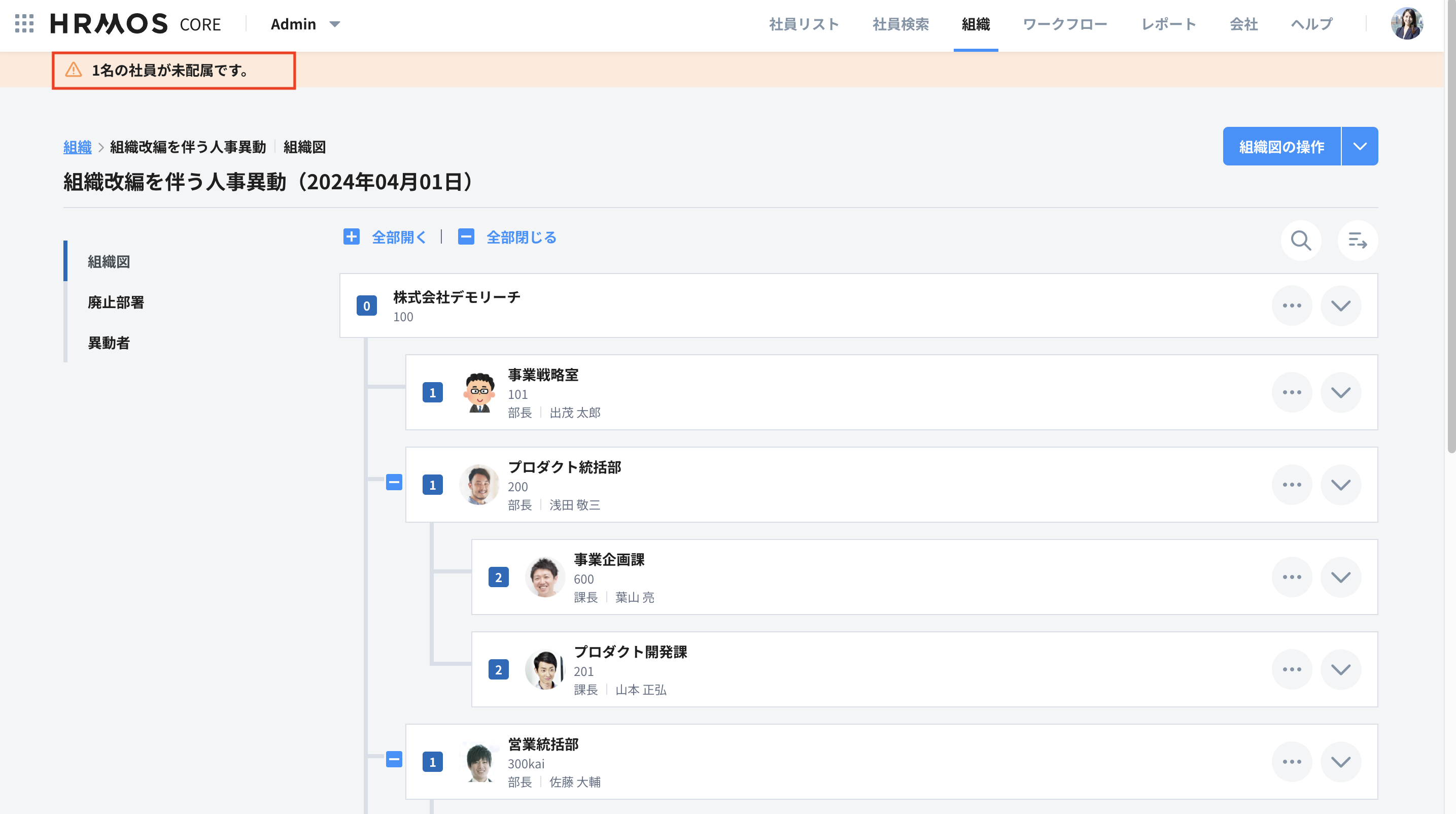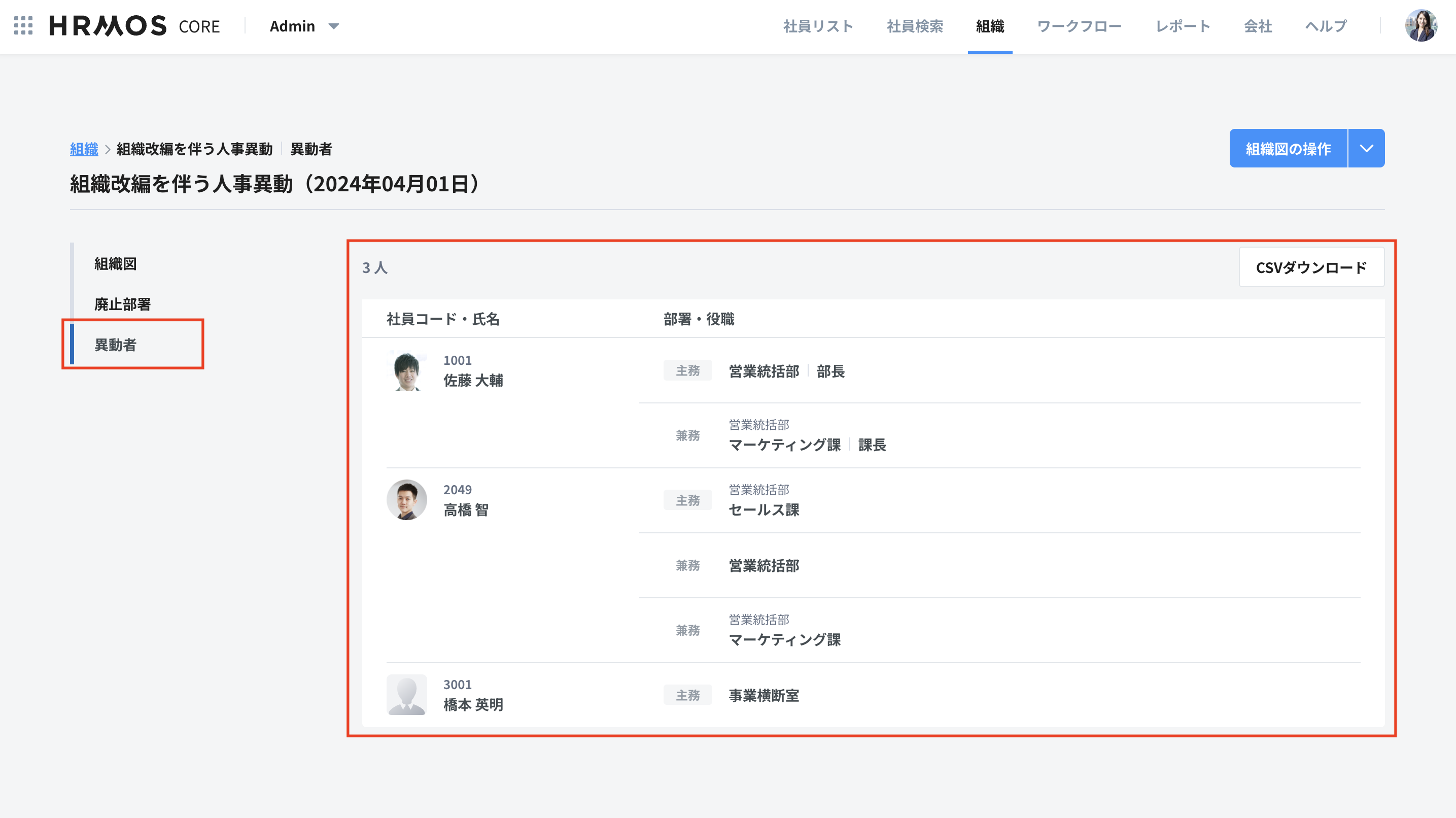 以下例として、2024/5/1付の組織図「組織改編を伴う人事異動」において社員の配属をCSV一括登録します。