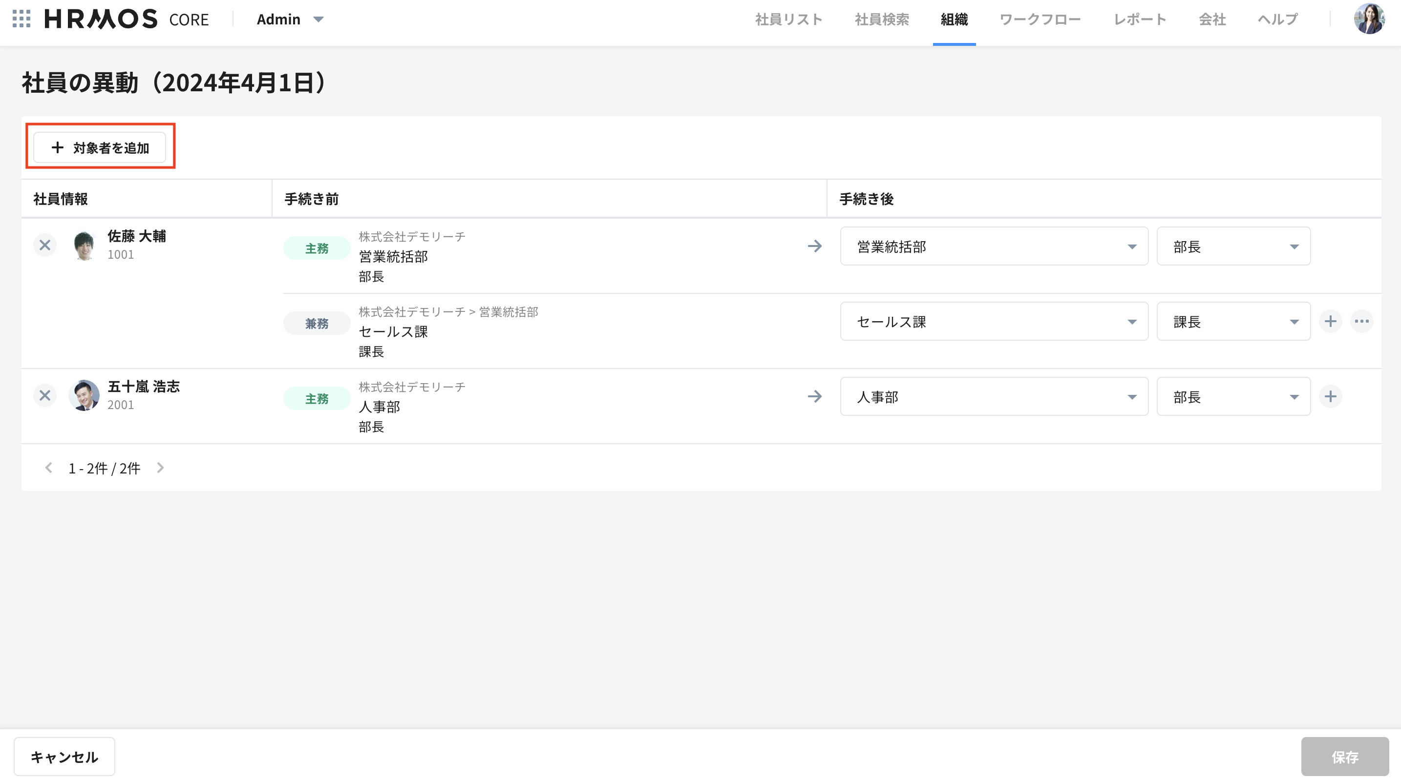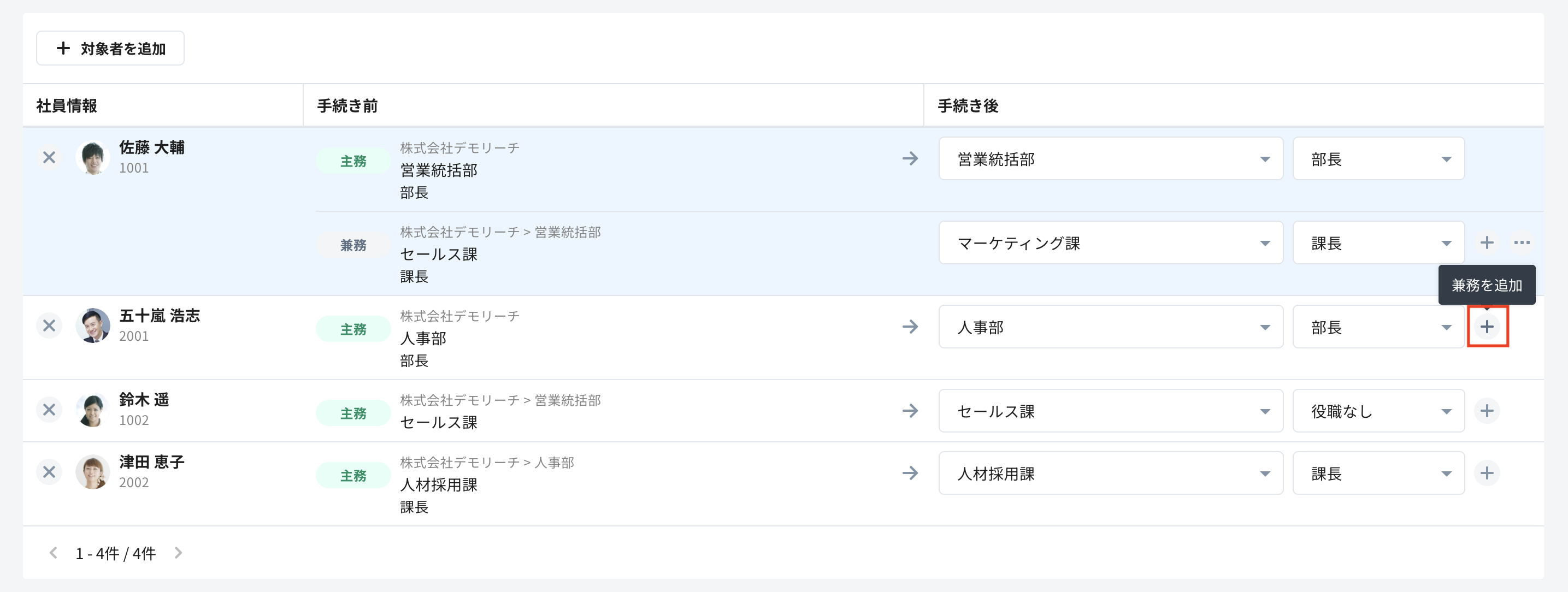 3. 社員の異動画面にて、「対象者を追加」から、異動手続きを行う社員を追加します。
