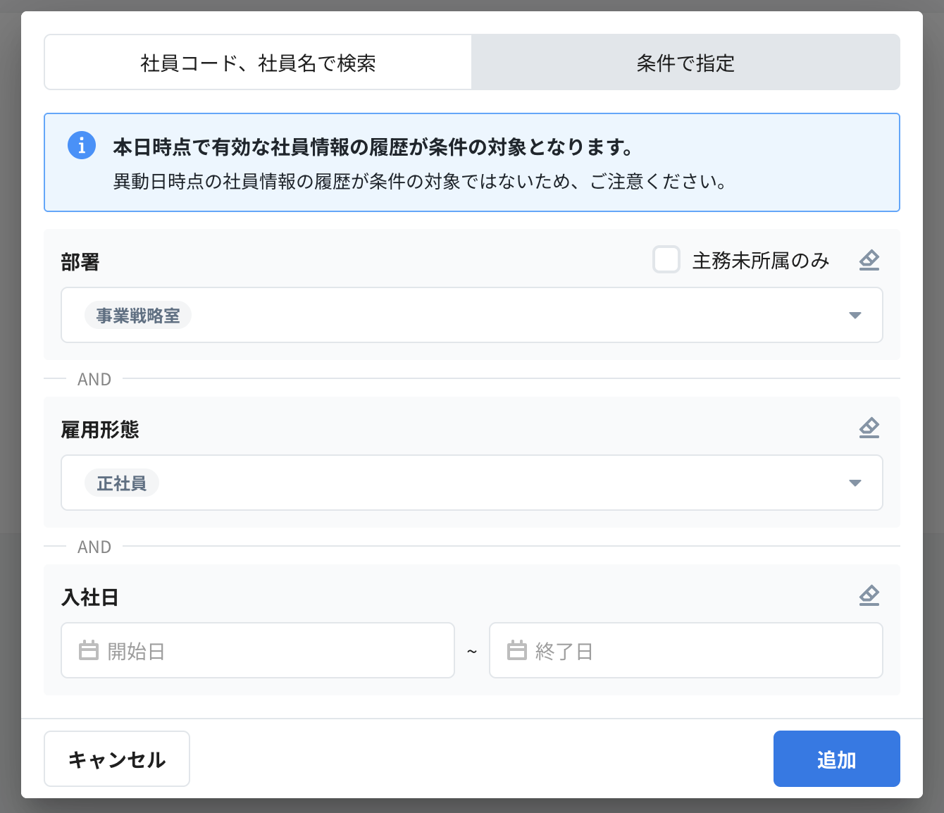 - 検索に合致する社員情報は、本日時点で有効な社員情報の履歴が対象となります。