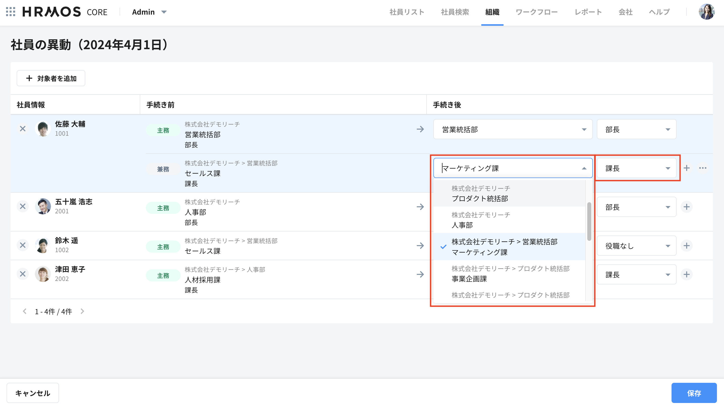 5. 社員の異動画面にて、社員の部署・役職をそれぞれ選択します。