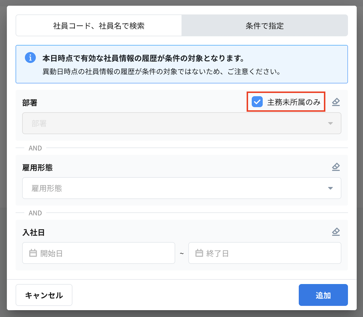 未配属の社員を異動させたい場合は、対象者を追加 > 条件で指定 > 「主務未所属のみ」を条件に設定すると、未配属の社員の異動を登録できます。