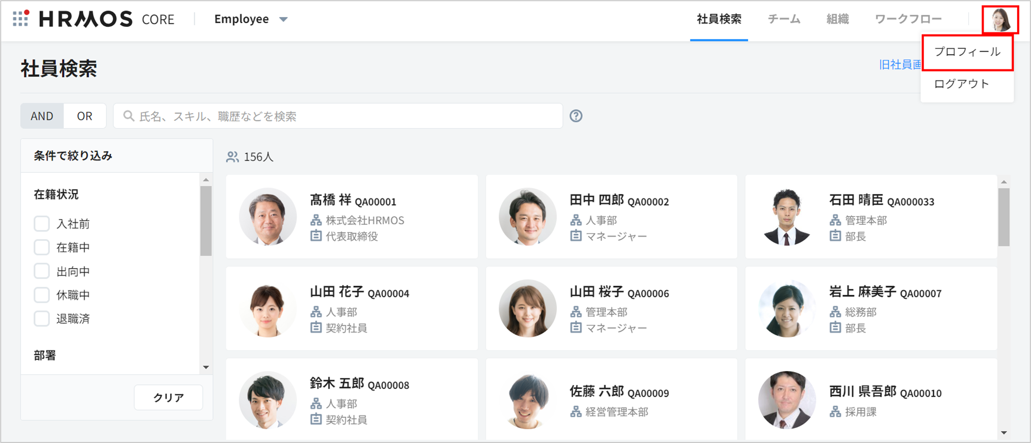 1. HRMOSにログインし、Employee(社員画面)にて、右上プロフィール画像より「プロフィール」タブをクリックします。