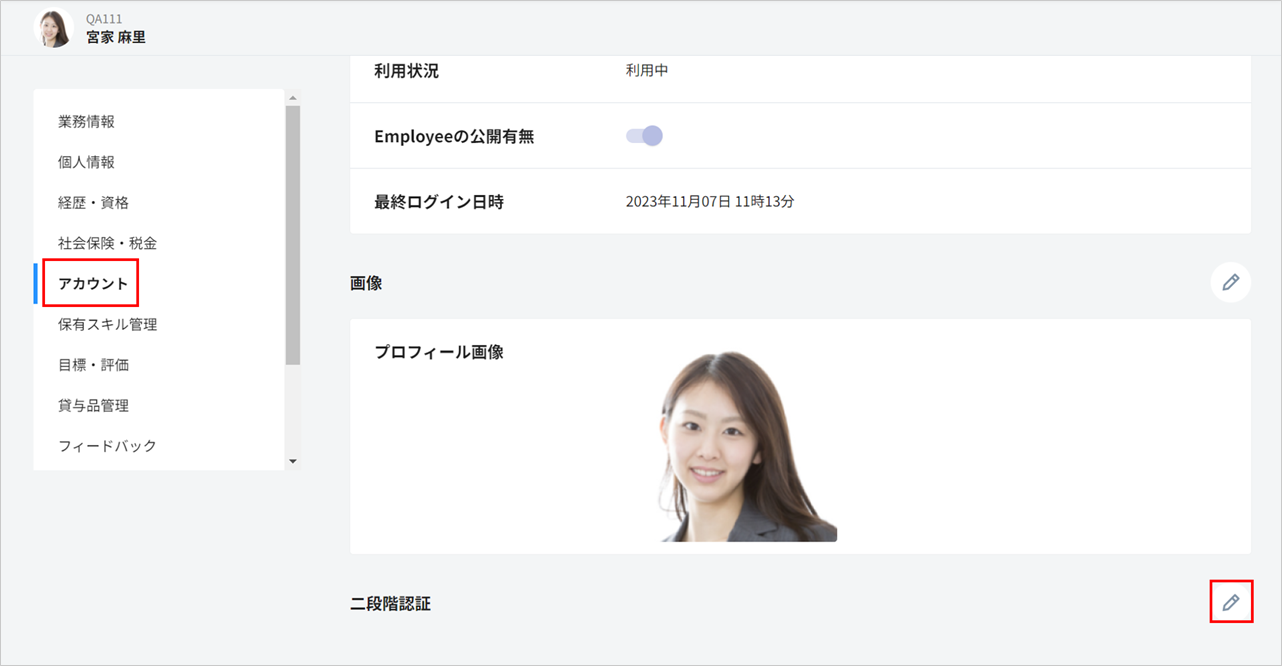※「エンピツ」アイコンが表示されない場合、二段階認証の使用が許可されておりません。必要に応じて社内のHRMOS CORE管理者へお問い合わせください。