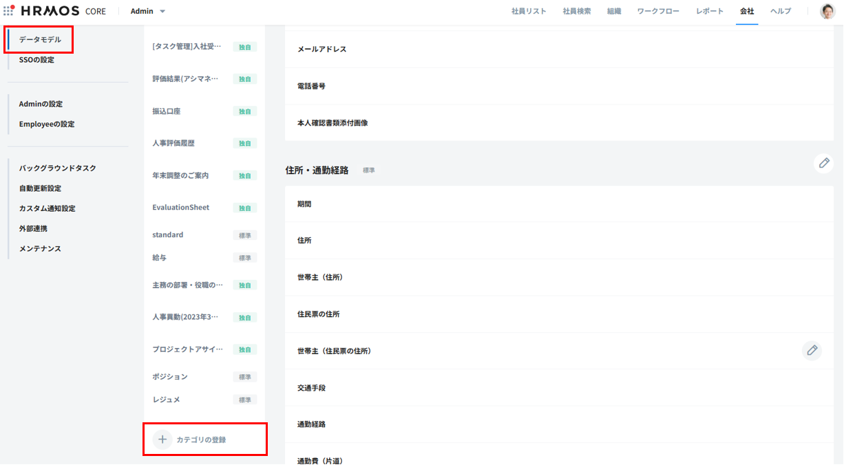 1. Admin(管理画面)にて、「会社」タブ >「データモデル」をクリックします。