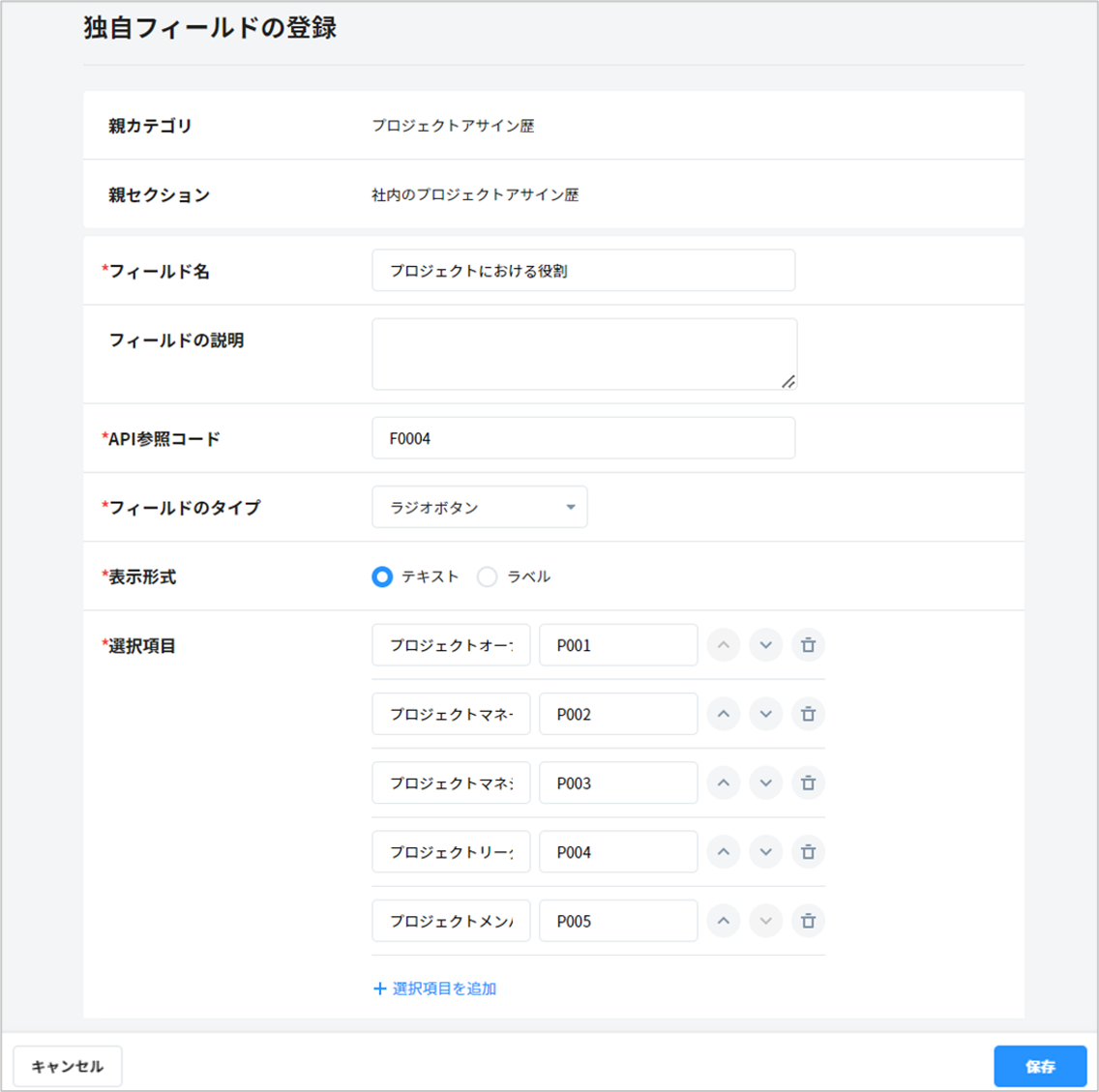 ・親カテゴリ:手順1で登録したカテゴリ「プロジェクトアサイン歴」を選択します。