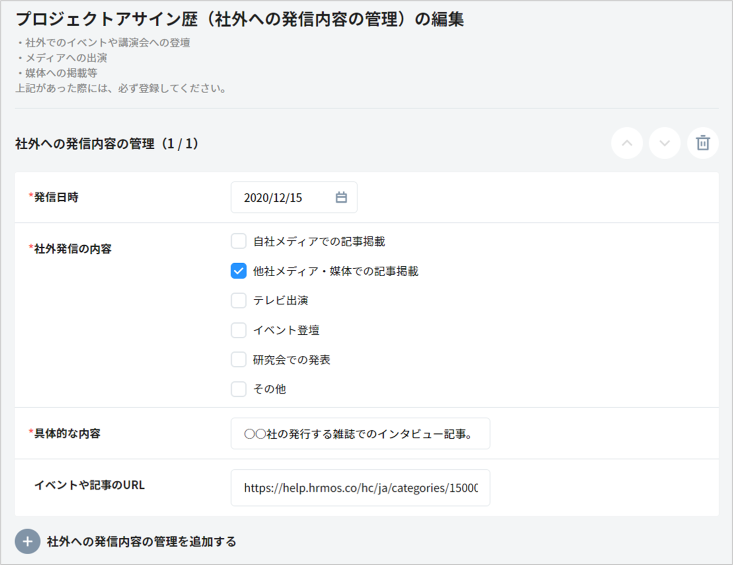 【例③:社外発信内容の管理(社外での講演歴、登壇歴など)】