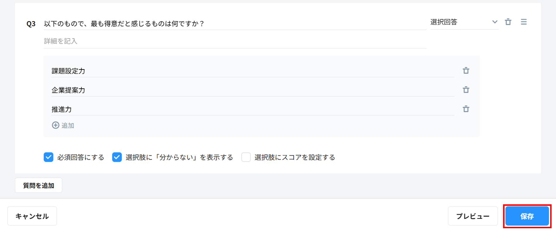 「選択肢」の記入、「必須回答にする」「選択肢に「分からない」を表示する」「選択肢にスコアを設定する」を設定します。