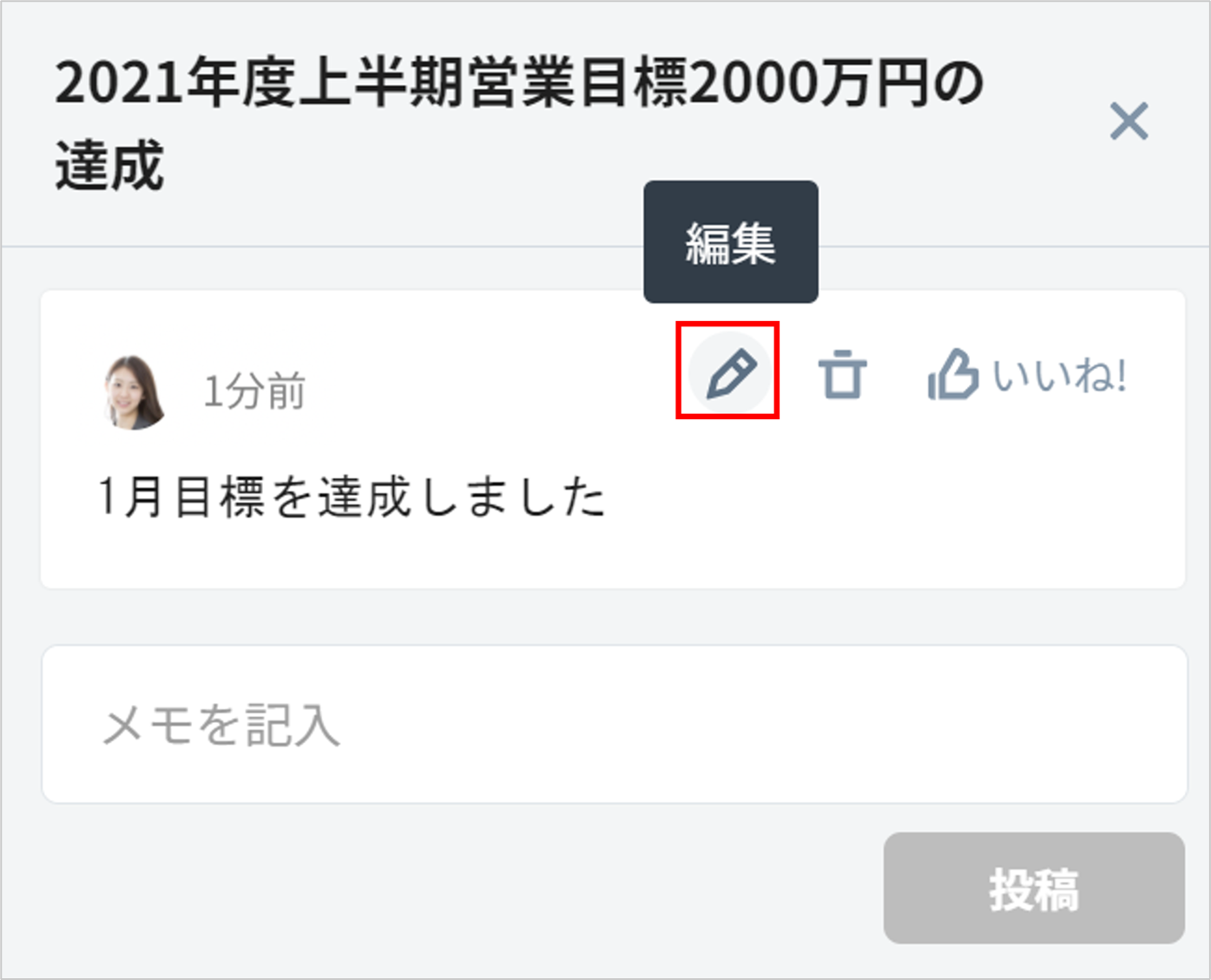 目標に対するアクティビティについて、被評価者および評価者が記入内容を削除・編集できます。