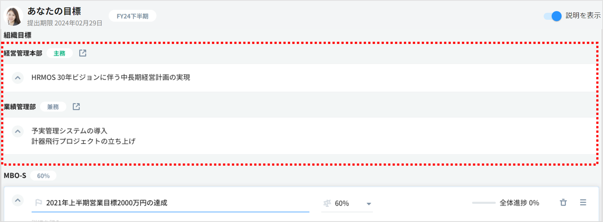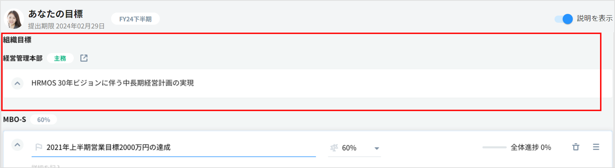 各社員の目標の入力画面には、所属する組織の組織目標が表示されます。