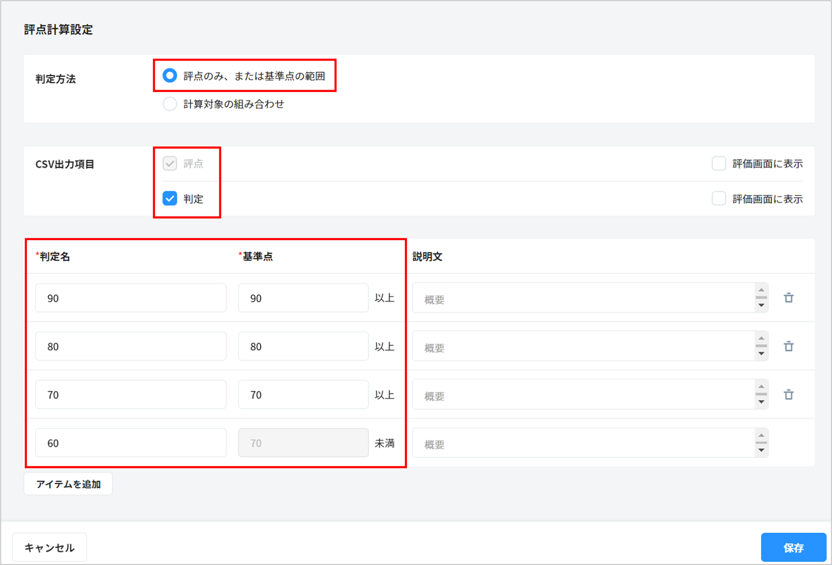 例では、「判定名:S」「基準点:90以上」