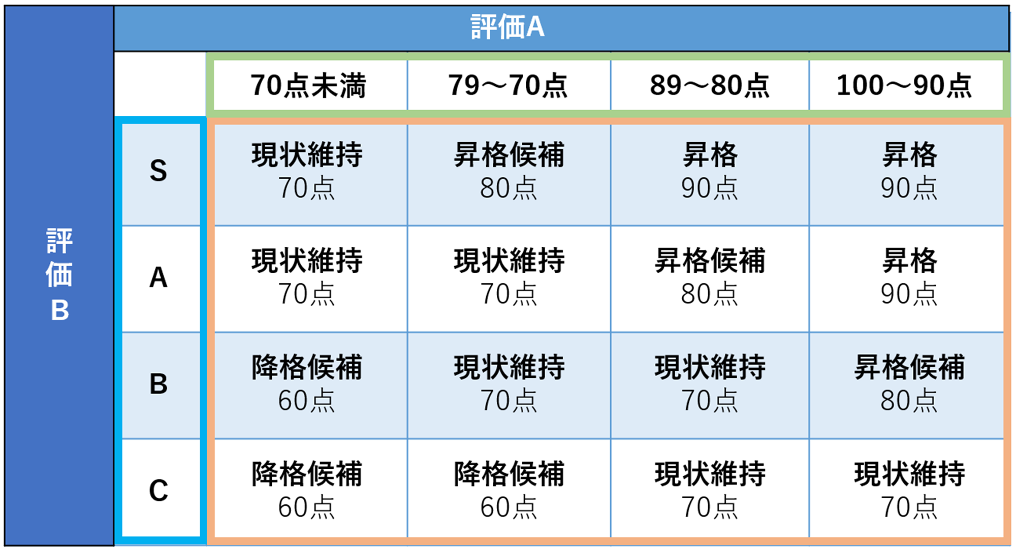 評価A:90~100点 かつ 評価B:Sだったら「昇格」