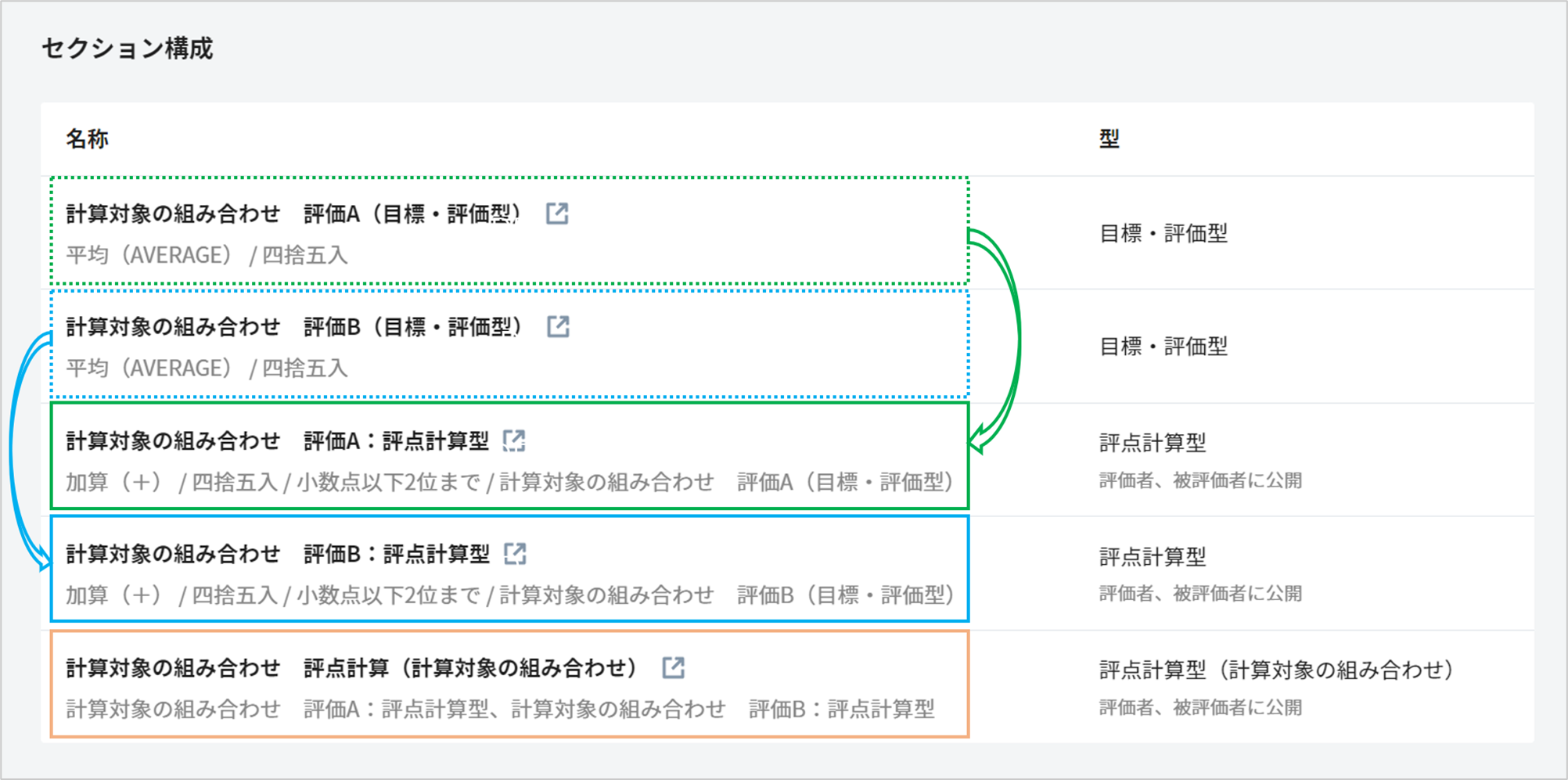 ・評価Aの判定と評価Bの判定を組み合わせるための評点計算型セクション(橙枠)
