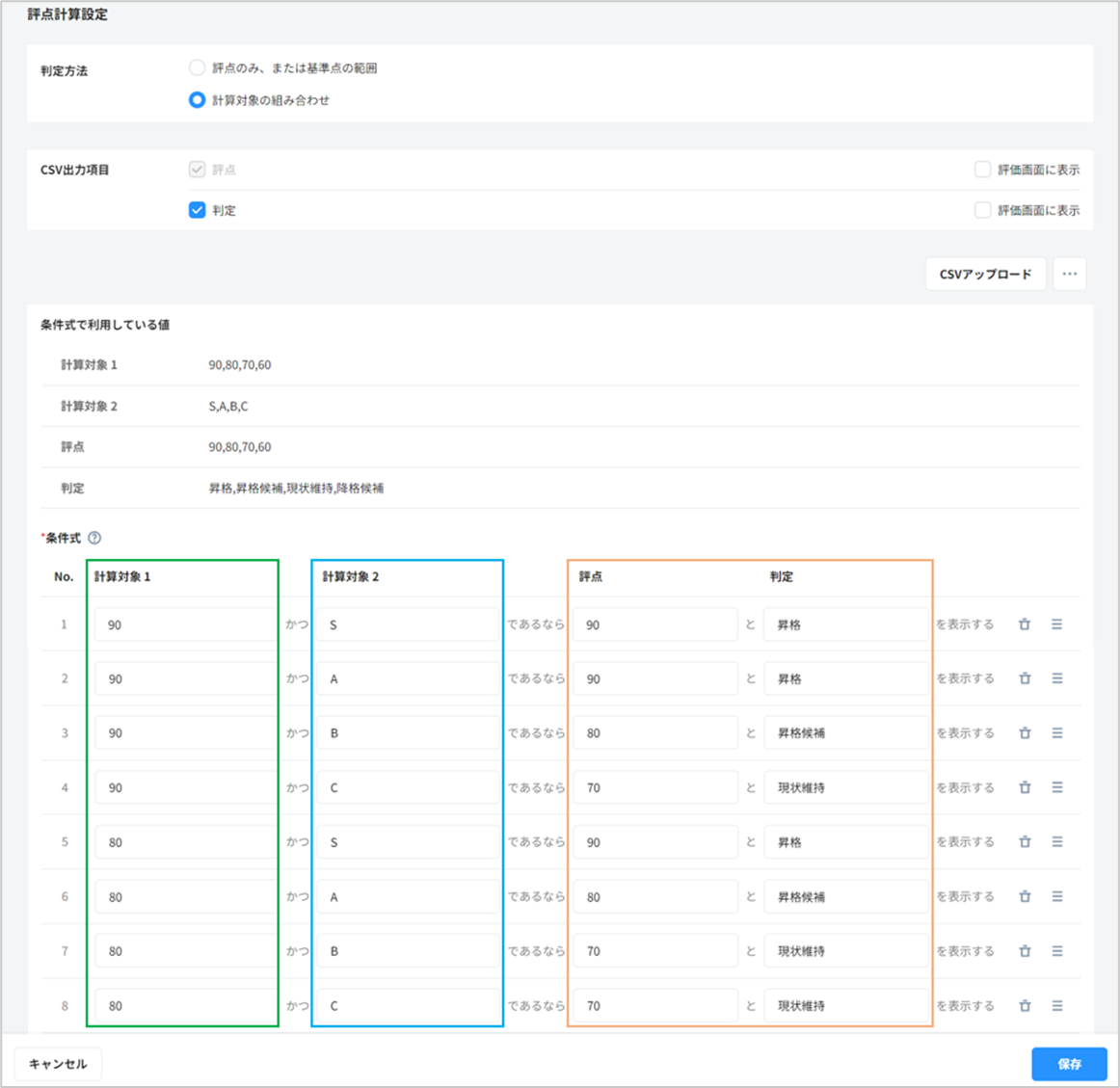 「計算対象1:80」かつ「計算対象2:A」であるなら「評点:80」と「判定:昇格候補」を表示する… のように設定していきます。