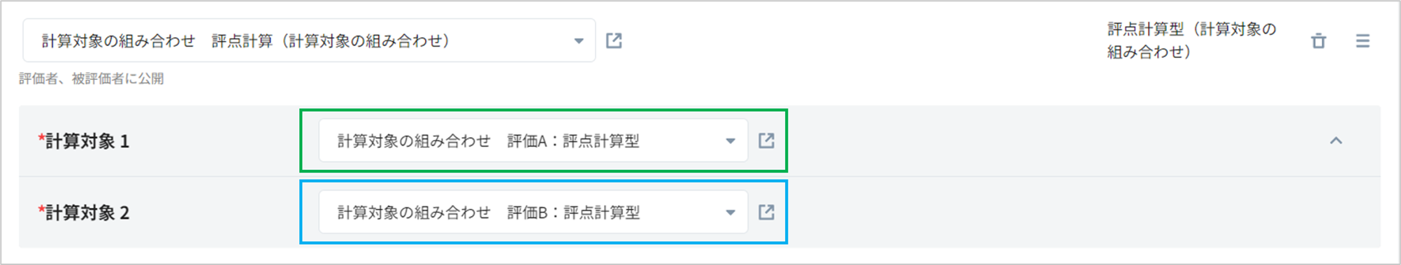 計算対象1,2にそれぞれAの評点計算型セクション(緑枠)、Bの評点計算型セクション(青枠)を設定してください。