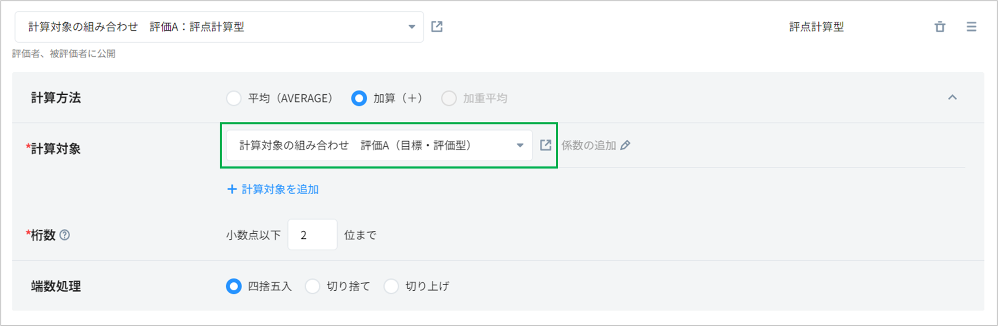 Aの評点計算型セクション(緑枠)へ、計算対象へ評価Aセクションを設定します。