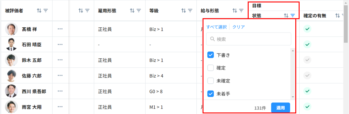 目標>状態というテーブルにおいてフィルタ機能を使って、「下書き」状態の社員を特定します。