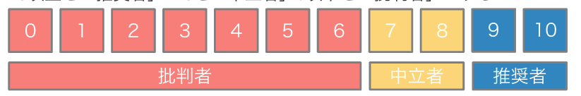 回答スコアを以下と分類し、推奨者スコアから批判者スコアを引くことで