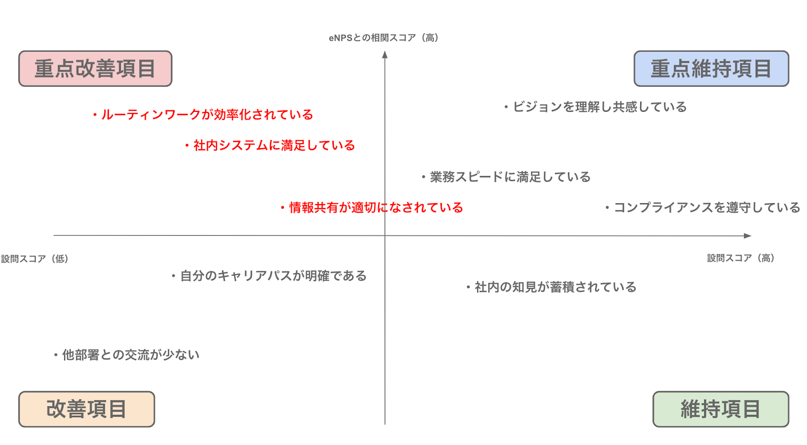 「eNPSとの相関スコア」が高く、「設問への回答スコア」が低いものに着手していきます。