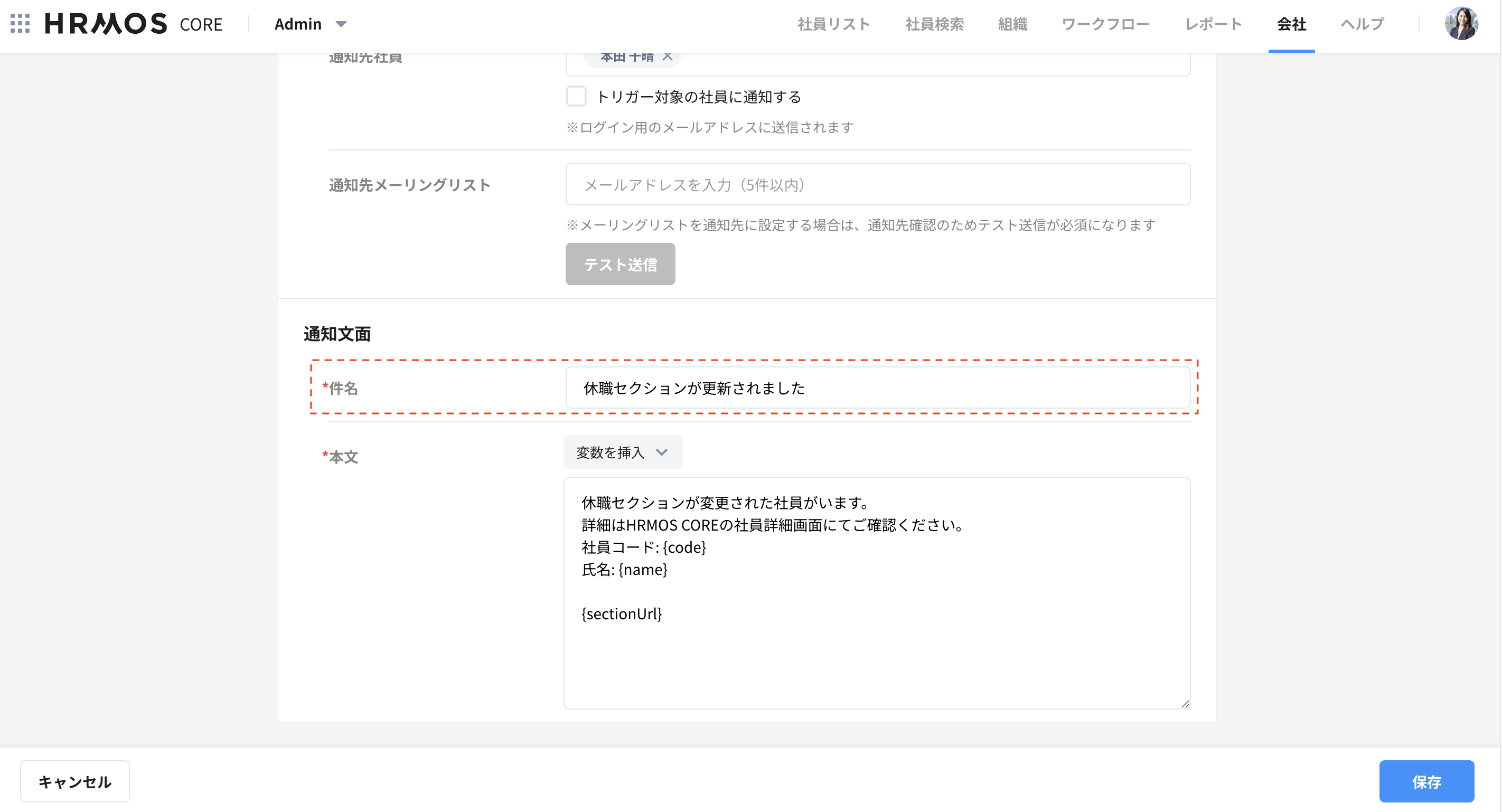 デフォルトで、トリガー対象に設定した社員の社員コード・氏名・トリガーに設定したセクションのURLが反映しています。必要に応じて編集してください。