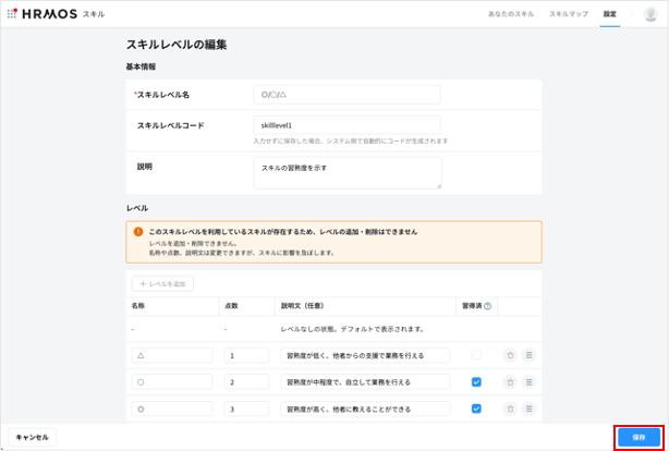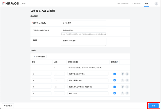 画面内にある入力項目を埋めて「保存」をクリックすると、スキルレベルがスキルレベルマスターに追加されます。