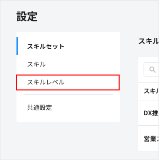 画面左側のサイドメニューにある「スキルレベル」をクリックすると、スキルレベルの一覧画面が表示されます。
