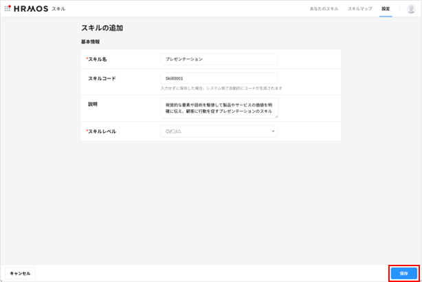 画面内にある入力項目を埋めて「保存」をクリックすると、スキルがスキルマスターに追加されます。