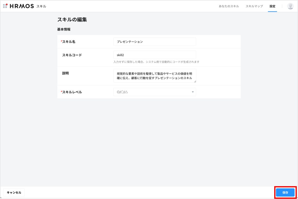 画面内にある入力項目で変更したい箇所を編集し「保存」をクリックすると、スキルの変更が保存されます。