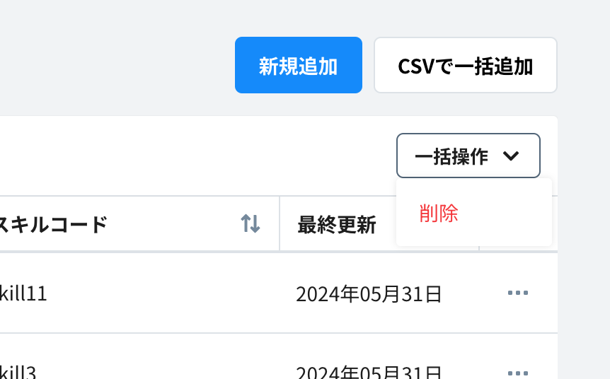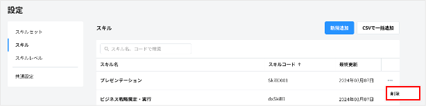 1. スキルの一覧画面で、削除したいスキルの右側のメニュー >「削除」をクリックする