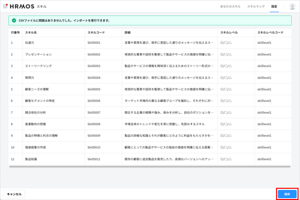 画面内に表示されている内容を確認したのち、「保存」をクリックすると、スキルが一括で追加されます。