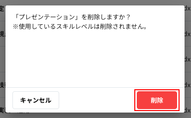 スキルマスターのリストから、削除したいスキル名の右側にあるメニューを押して、メニューの「削除」をクリックすると、モーダルが表示されます。