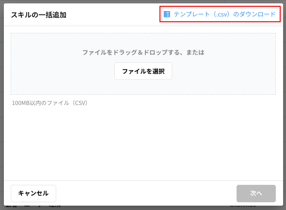 モーダル内の「テンプレート(.csv)のダウンロード」をクリックすると、スキルの一括追加用のCSVテンプレートファイルがダウンロードされます。