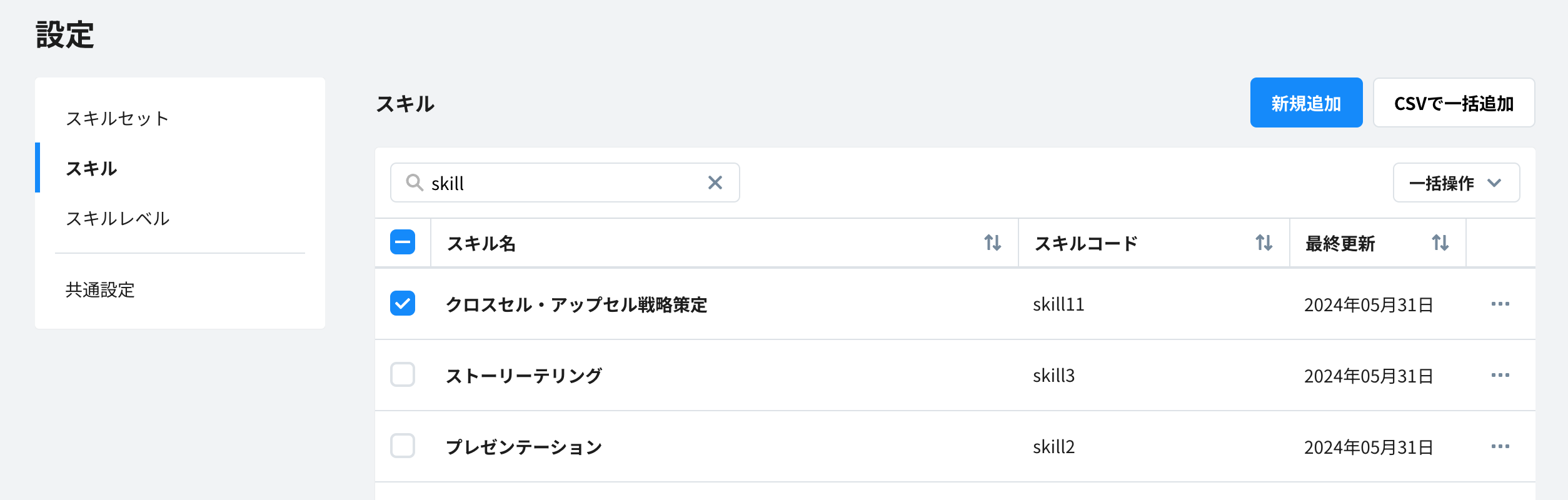 1. スキルの一覧画面で、削除したいスキルの左側のチェックボックスをクリックする