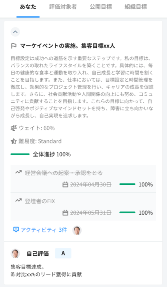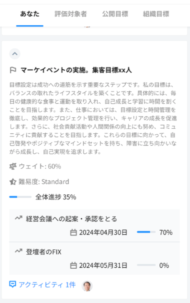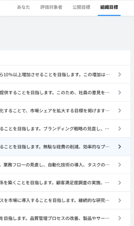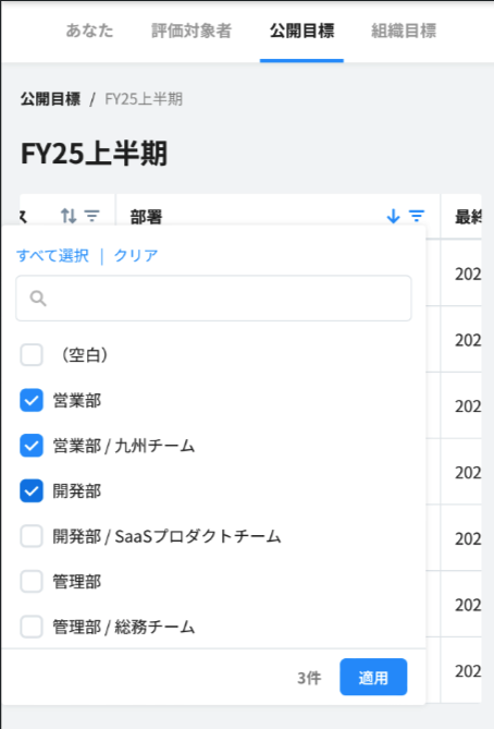 目標が公開されている社員を、確認することができます。