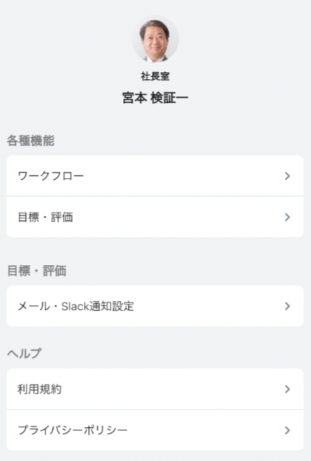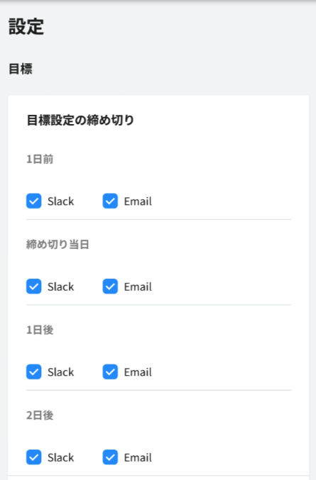 「右下メニュー」 > 目標・評価 >「メール・Slack通知設定」をタップ