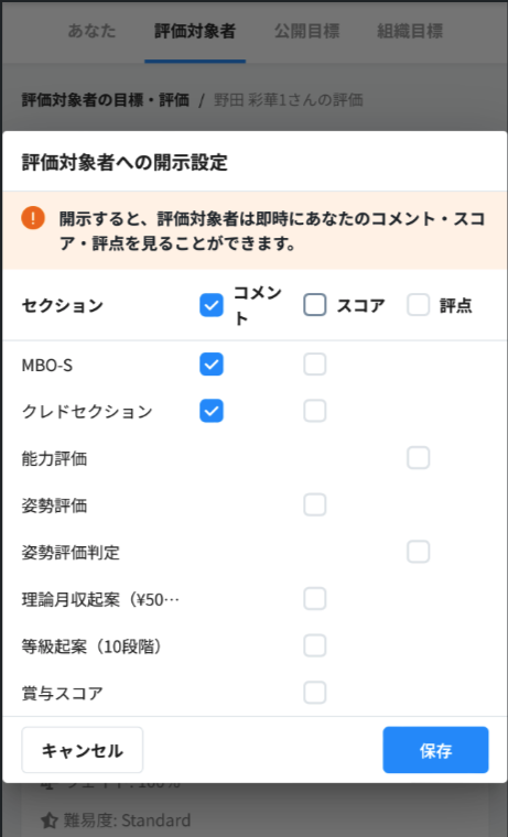「・・・」> 「評価対象者への開示設定」をタップ