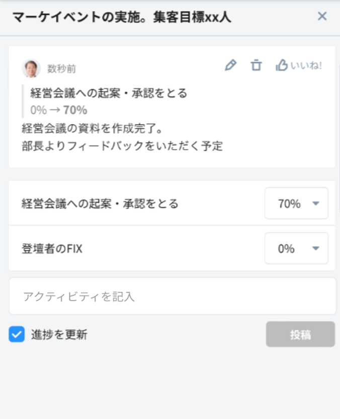 「アクティビティ」において、コメント入力や進捗更新を行うことができます。