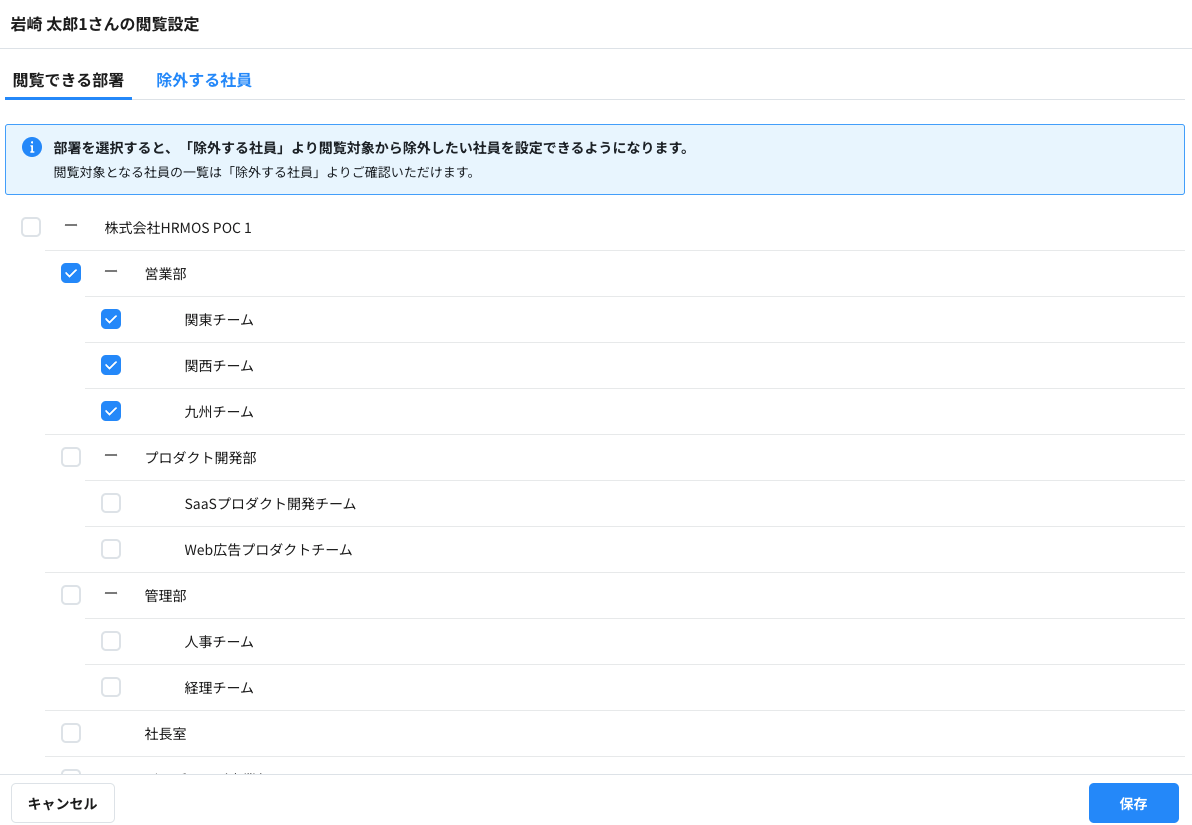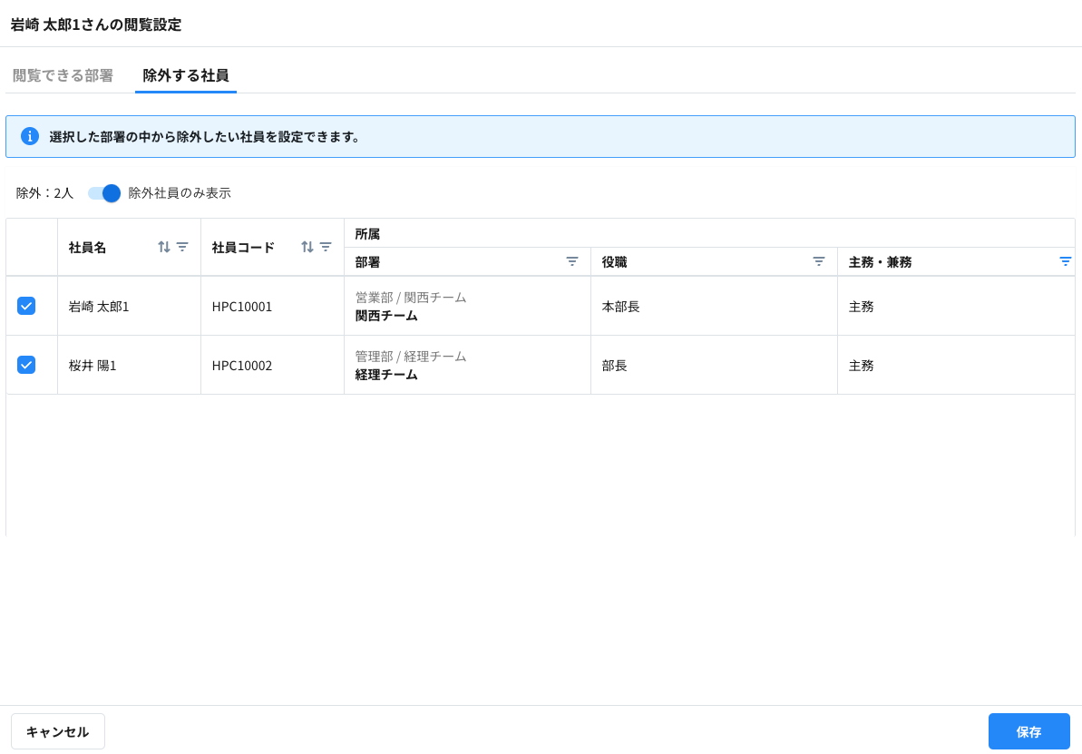 例2:営業部門長に、営業部門メンバーの閲覧権限を付与する。また部門長と事業部人事を除外する
