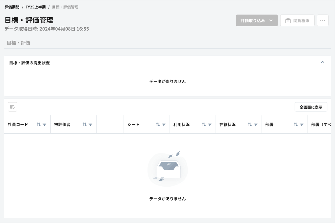 権限付社員に、閲覧権限が付与されていない場合、「データがありません」と表示されます。