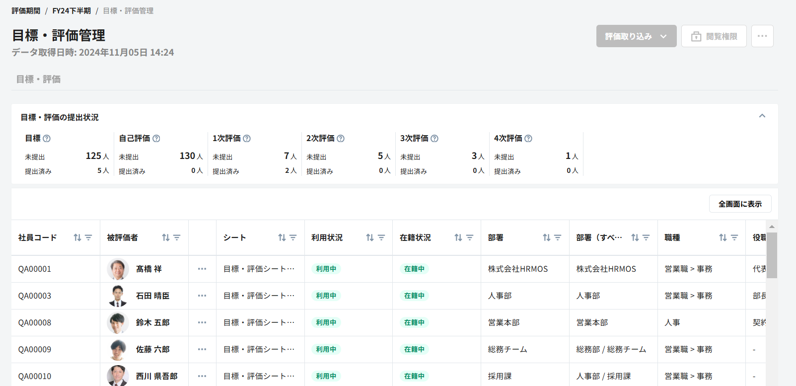 部門長や、事業部人事の社員に、目標・評価管理の閲覧権限を付与する(参考記事)